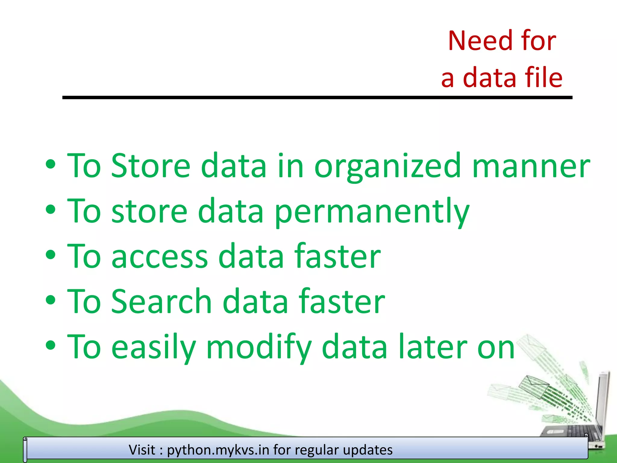 The document discusses file handling in Python. It begins by explaining the need for files, such as to store data permanently and access it faster. It then covers opening and closing files, different file modes, reading and writing text files, modifying files by replacing strings, and using file attributes and methods like seek, tell, readlines and writelines. The document provides examples to demonstrate basic text file operations in Python.