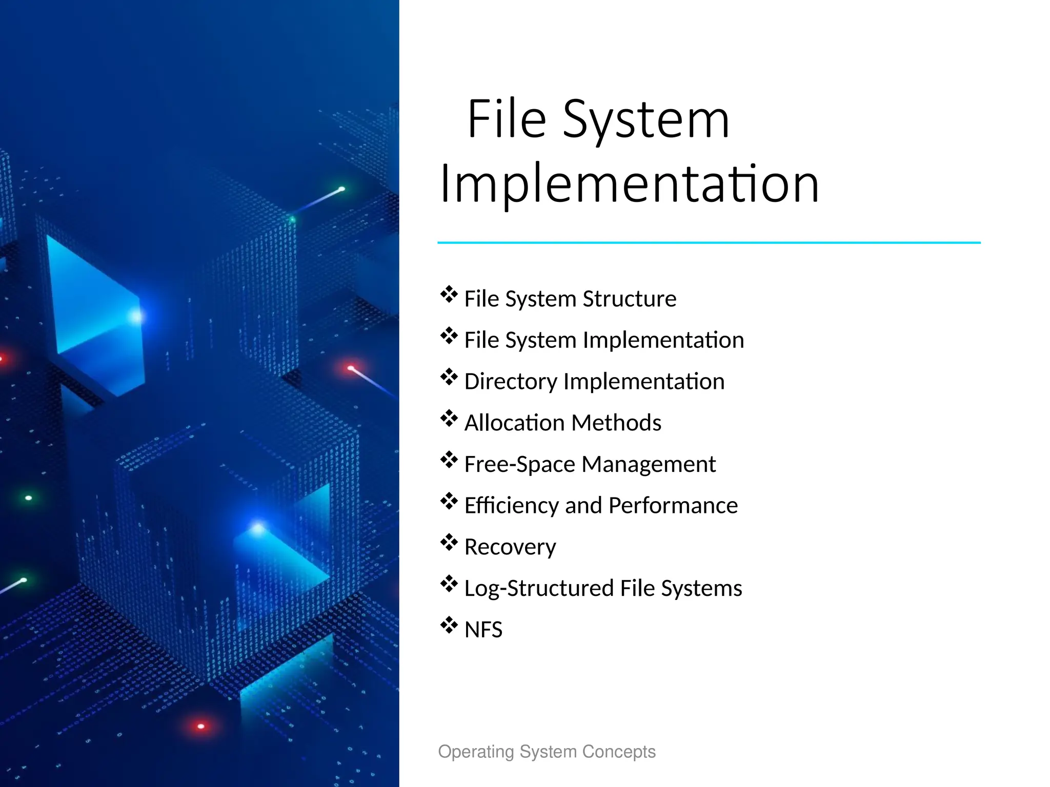 The document provides an overview of file system implementation in operating systems, covering key topics such as file structure, directory implementation, allocation methods, and free-space management. It discusses different allocation techniques like contiguous, linked, and indexed allocation, as well as the management of free space and performance optimization. Additionally, it covers the concept of log-structured file systems and the architecture of the Network File System (NFS) for accessing remote files across networks.
