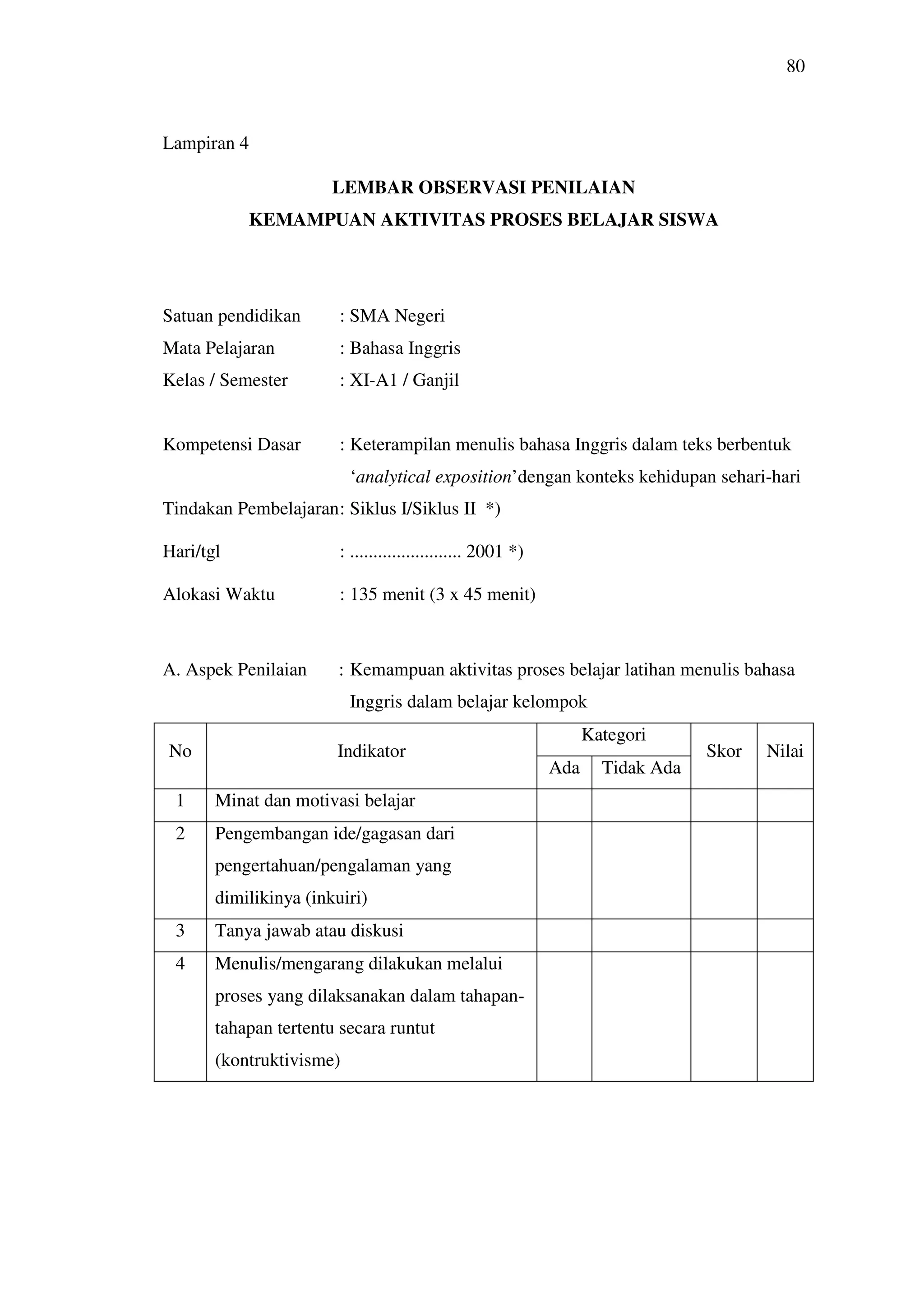 Dokumen ini membahas penilaian kemampuan aktivitas proses belajar siswa dalam mata pelajaran Bahasa Inggris di SMA, berfokus pada keterampilan menulis teks 'analytical exposition'. Penilaian mencakup indikator seperti minat belajar, pengembangan ide, dan refleksi, dengan bobot skor maksimum 80. Kriteria penilaian membagi taraf kemampuan siswa ke dalam lima kategori, dari 'amat baik' hingga 'sangat kurang'.