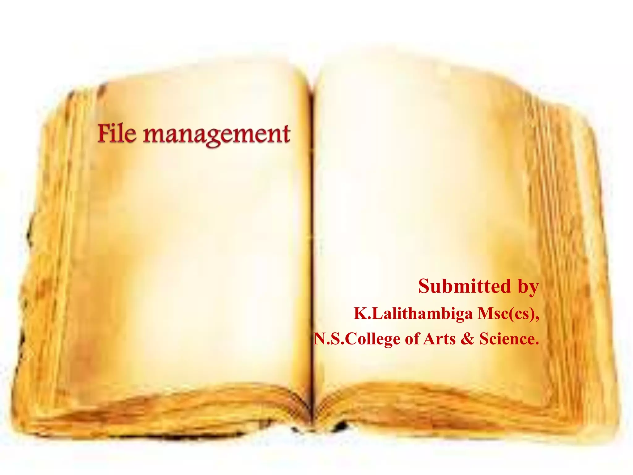 The document discusses file management in C programming. It defines a file as a sequence of bytes stored on disk for permanent storage of data. It describes basic file operations like opening, reading, writing and closing files. It explains functions for high level input/output like fopen(), fclose(), getc(), putc(), fprintf(), fscanf(), getw(), putw() and their usage. It also covers error handling functions like feof() and ferror(). The document discusses random access of files using functions like ftell(), fseek() and rewind(). It finally talks about command line arguments and how they are passed to main() in C programs.