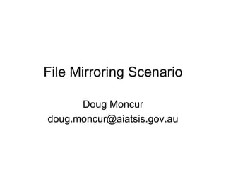 This document discusses mirroring a collection of files from a central archive to a local community repository. It proposes building a machine at the central archive to test mirroring and load the data, then ship it to the community. The community could then build their own front-end using the mirrored data, either developing their own interface or using Dspace. Updates from the community could then be periodically mirrored back to the central archive. Inspiration is drawn from work done by Tim Hopkins at the University of Kent to develop robust mirroring technology using turn-key packages that allow any site to set up their own mirror service on cheap hardware.