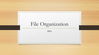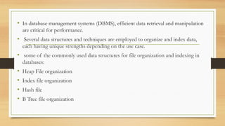 The document discusses various file organization methods and indexing techniques in database management systems (DBMS), focusing on their efficiency for data retrieval and manipulation. Key structures include heap file organization, primary and secondary indexes, hashing, and B-trees, each with distinct advantages and disadvantages depending on the use case. Overall, it highlights how these methods impact performance, especially regarding fast insertions, searches, and handling range queries.
