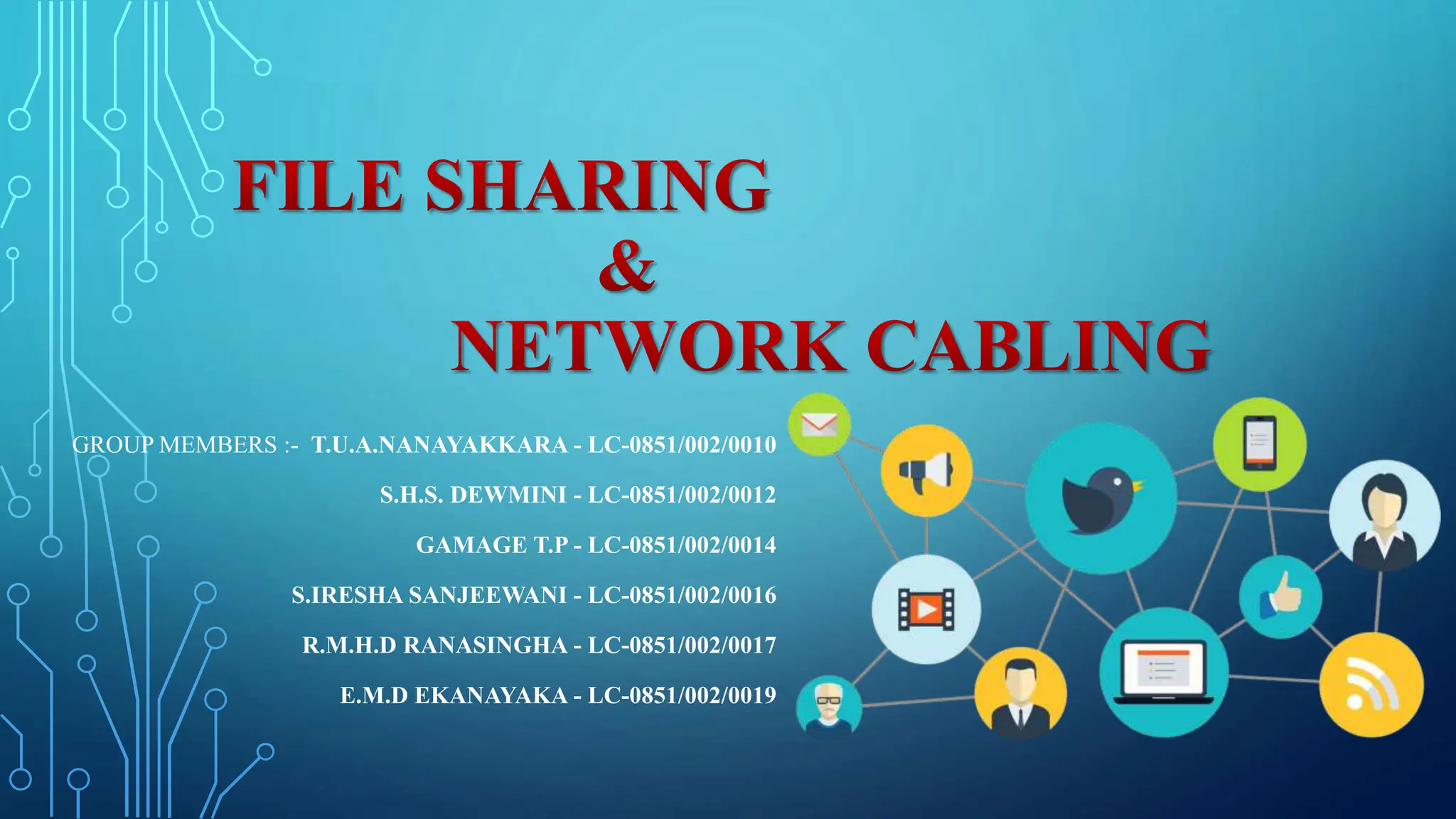 This document discusses file sharing and network cabling. It lists the group members and defines file sharing as the practice of distributing or providing access to digital media. It describes the two main ways of sharing files as directly between computers or between a computer and a server. The document defines network cabling as the medium through which information travels between network devices. It lists different types of network cabling and discusses the relationship between file sharing and network cabling. Finally, it outlines the advantages of sharing files through a network like shared devices and ease of sharing, as well as disadvantages such as high costs and complexity of large networks.