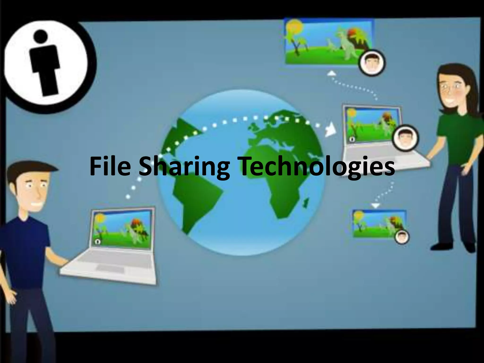 File sharing allows users to access and share files over a network. It can be public or private and allows various levels of access like reading, writing, or modifying files. There are advantages like centralizing files for easy administration and updates, but also disadvantages like security problems, data redundancy, and lack of standardized structure. Different file sharing technologies include peer-to-peer networks with no central server, as well as instant messaging programs that allow file transfers between users. Common examples are AIM, ICQ, Windows Live Messenger, and Yahoo Messenger.