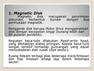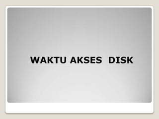 Dokumen tersebut membahas tentang waktu akses disk dan teknologi-teknologi yang terkait dengan hard disk. Secara singkat, dibahas mengenai komponen-komponen hard disk seperti kepala baca tulis dan track serta sektor. Selanjutnya dijelaskan rumus-rumus untuk menghitung waktu akses disk seperti waktu cari, latensi, dan salur data. Teknologi-teknologi pendukung kinerja dan kehandalan hard disk