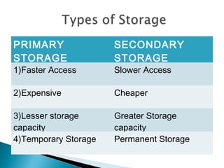 This document discusses primary and secondary storage. Secondary storage is used for permanent storage of data in files and has greater storage capacity than primary storage. A file contains records with fields, and each record is uniquely identified by a key field like student ID. Logical files connect programs to physical files on secondary storage. Files can be accessed sequentially, randomly using indexing, or directly using the key value.