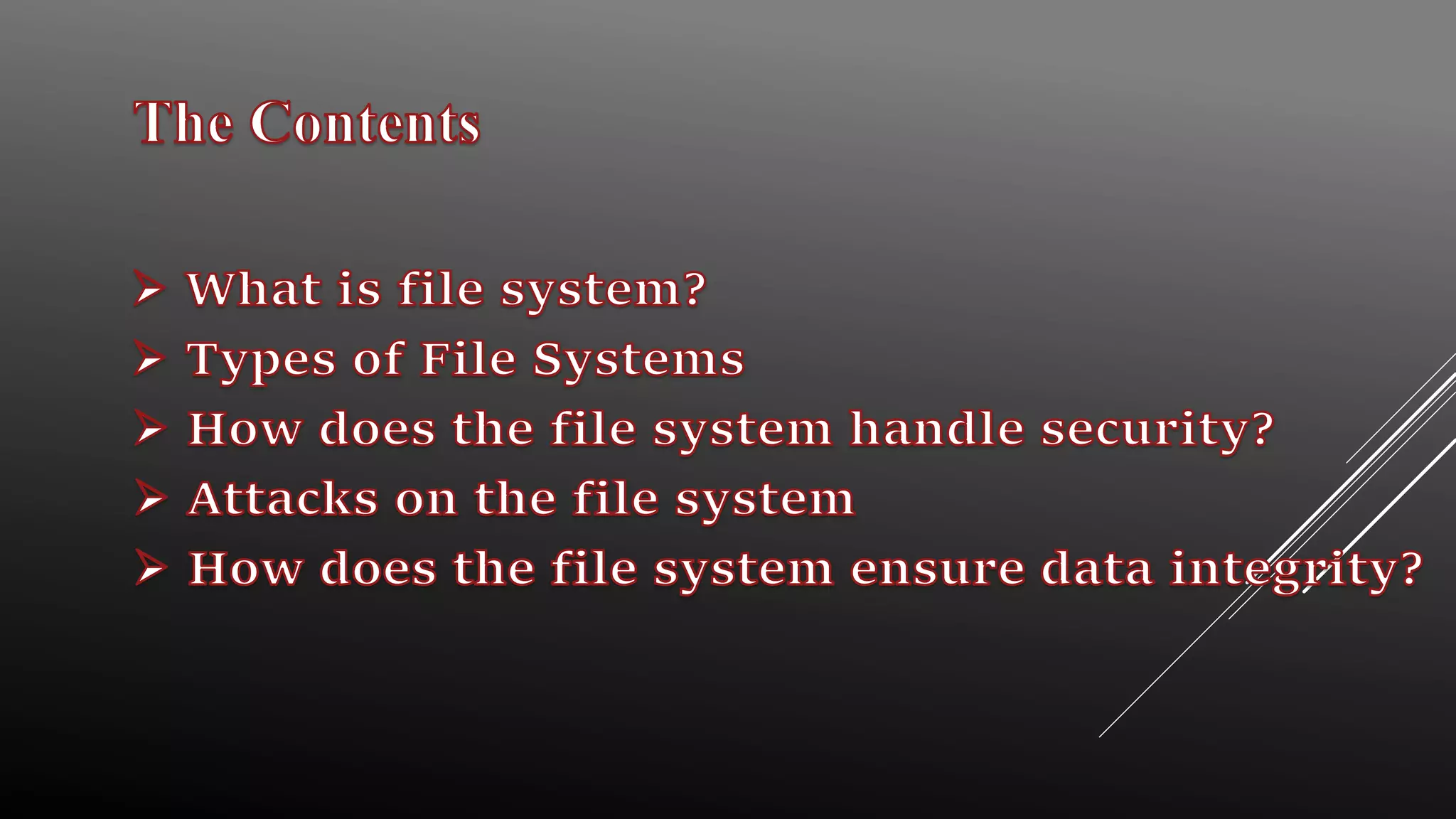 This document provides an overview of file system security, detailing the organization and management of files and directories on storage devices. It discusses various file systems such as FAT, NTFS, and HFS, and highlights security mechanisms including access control, encryption, and RAID configurations. Additionally, the document addresses common security threats like race condition attacks and alternate data streams, emphasizing the importance of access management to maintain data integrity.