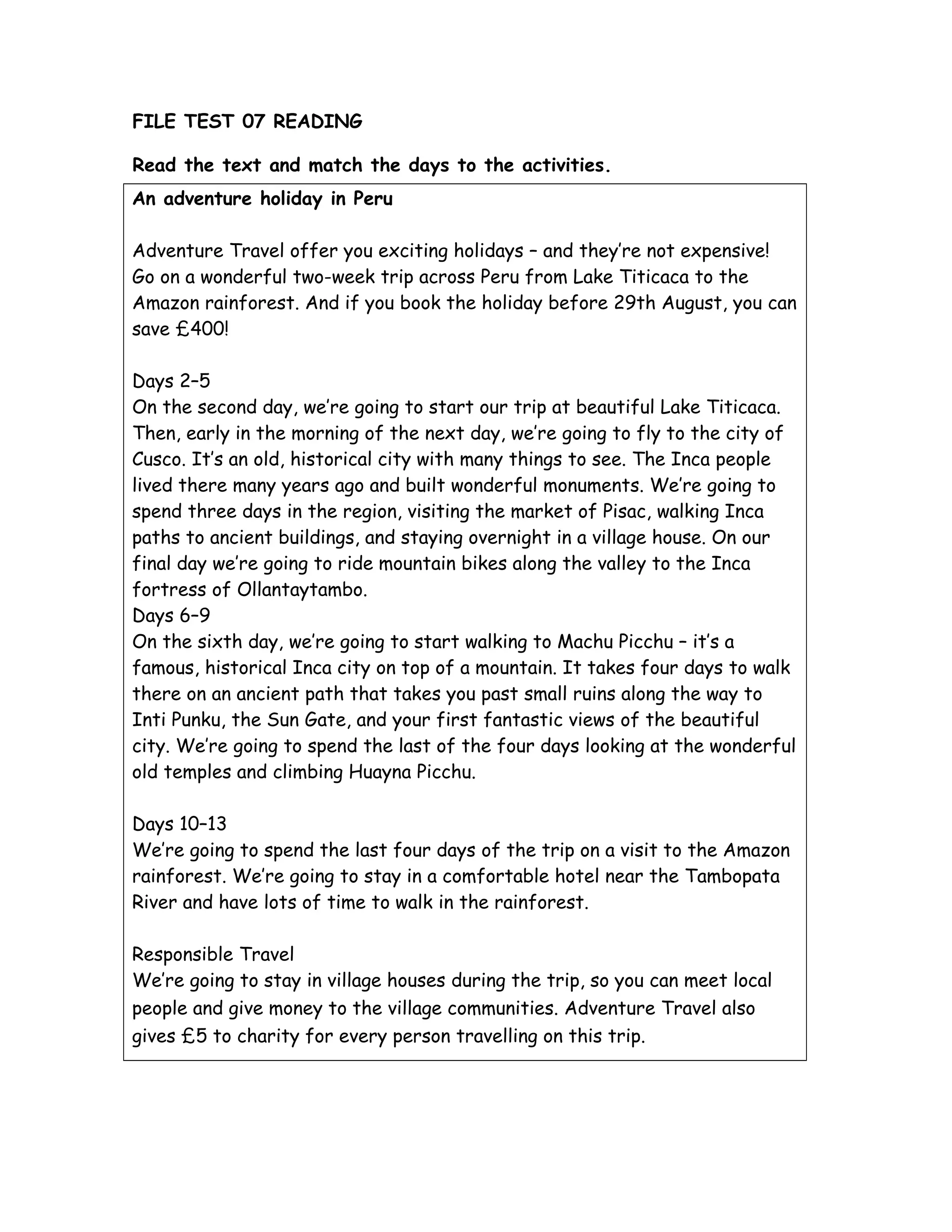 The document summarizes a two-week adventure trip across Peru from Lake Titicaca to the Amazon rainforest. The trip includes spending three days in the Cusco region visiting historical sites built by the Inca people, four days hiking the Inca Trail to Machu Picchu, and four days exploring the Amazon rainforest near the Tambopata River. Booking before August 29th saves £400 on the trip. The trip stays in village houses to interact with locals and supports local communities and charities.