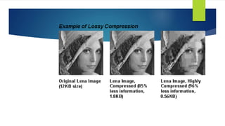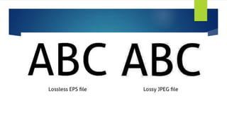 This document discusses and compares various digital image file formats including JPG, GIF, TIFF, PNG, BMP, and RAW. It explains the differences between lossy and lossless compression and how different formats support varying numbers of colors. Key points covered include the intended uses of formats for print versus web, how layers and transparency are supported, and recommendations for when to use specific formats for photographs, graphics, and other image types.