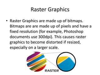 The document discusses different file formats used in digital graphics including raster graphics, vector graphics, and specific file types like JPEG, TIFF, GIF, BMP, PSD, AI, FLA, and WMF. It covers topics such as the advantages and disadvantages of different formats, optimizing files for web use, and managing assets through naming conventions and folder organization.