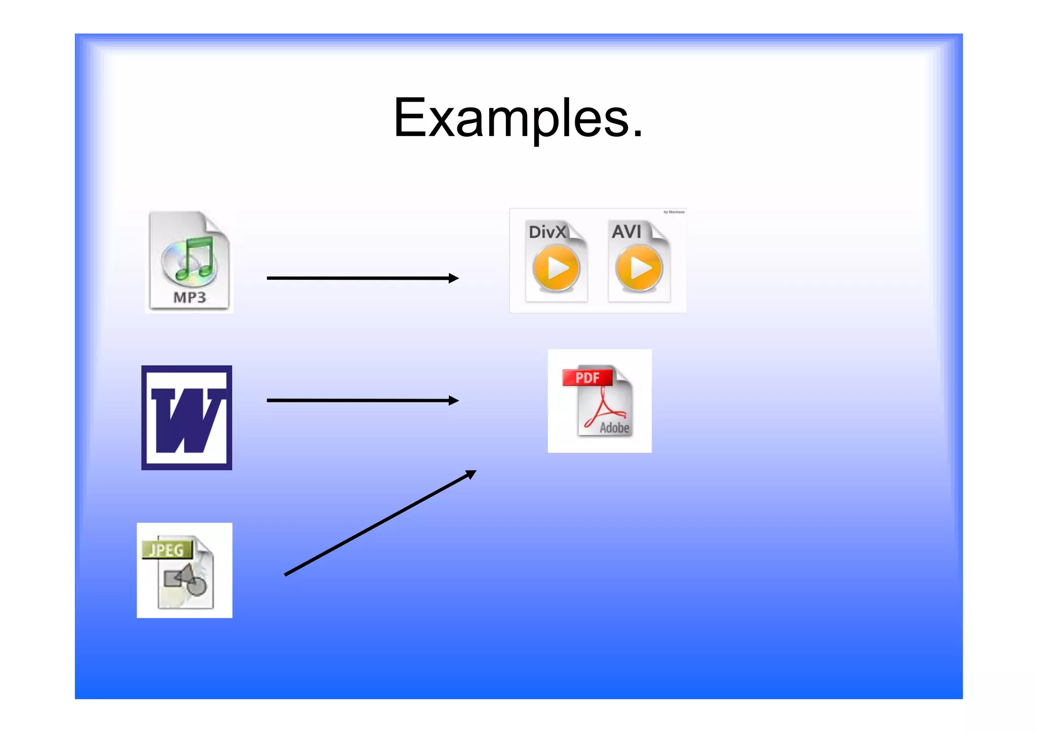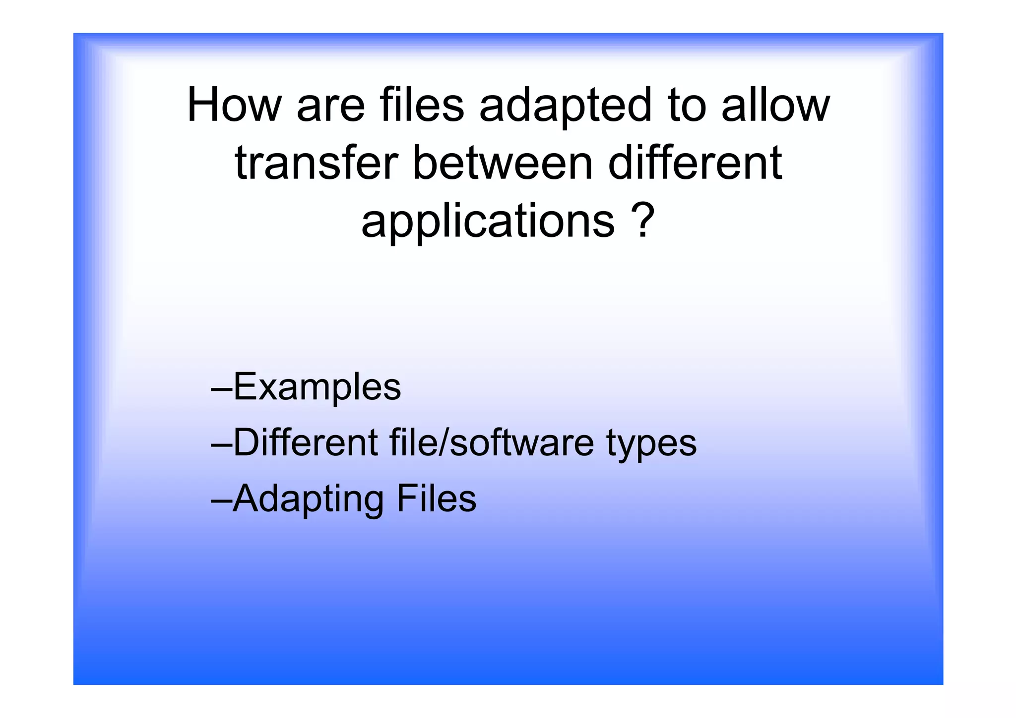 Files created in different applications have different formats. To allow transfer between applications, files can be adapted or converted from one file type to another. Common examples include converting Word documents to PDF, which makes the file compatible with more devices while maintaining a smaller file size. The process of converting file types changes the original format into a new format that can be opened by other applications.