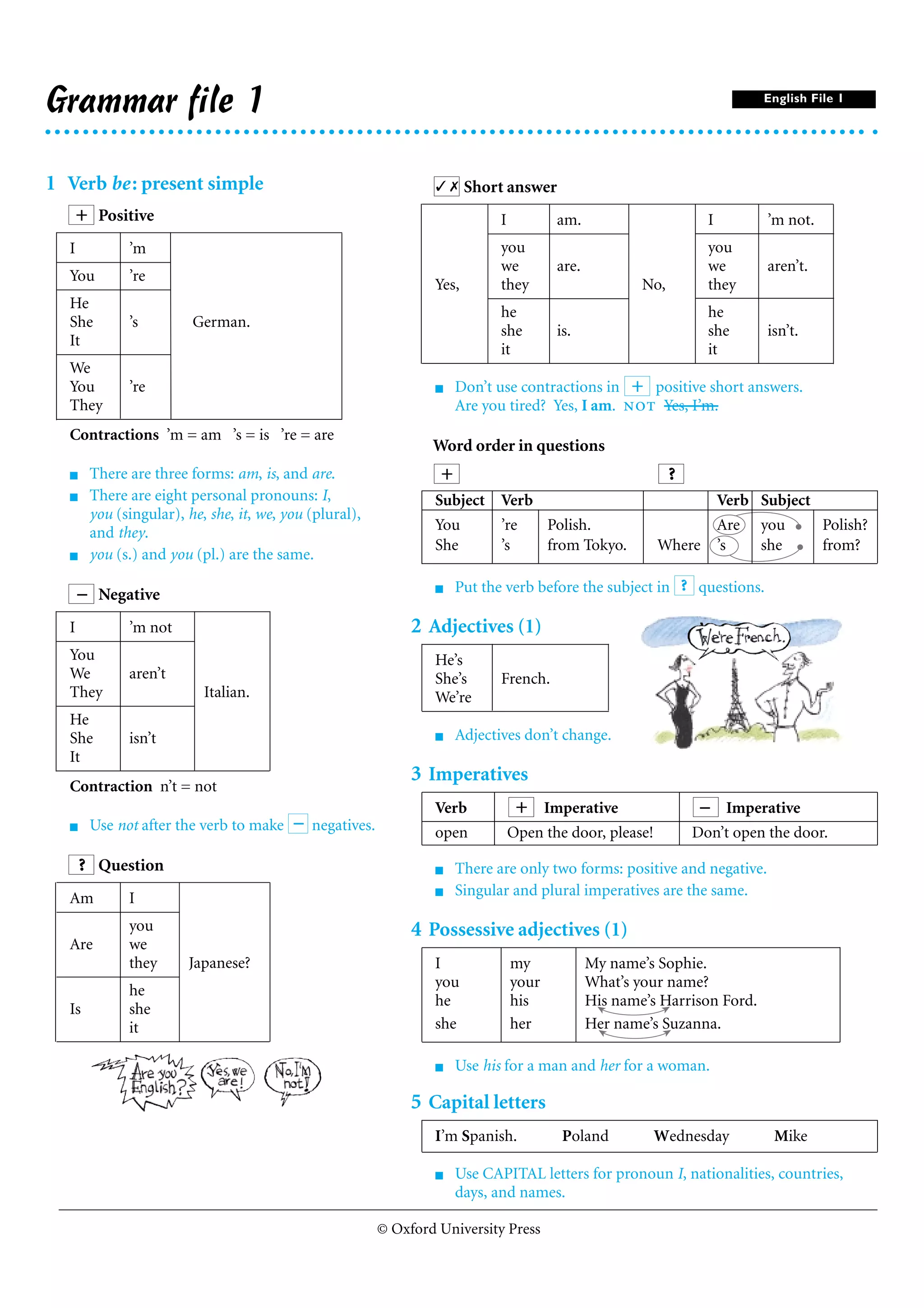 The document provides grammar rules and examples for verb conjugations, questions, adjectives, possessives, and capitalization in English. It includes: