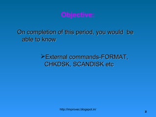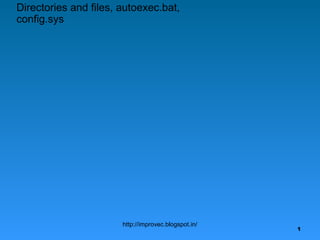 The document discusses directories, files, and commands in MS-DOS. It explains that directories and files are used to organize data, and that autoexec.bat and config.sys are configuration files that run commands automatically. It then discusses external commands like FORMAT, CHKDSK, and SCANDISK, as well as internal commands like COPY, DEL, DIR, and MD. Finally, it describes different types of files supported in MS-DOS like text files, batch files, and application files.