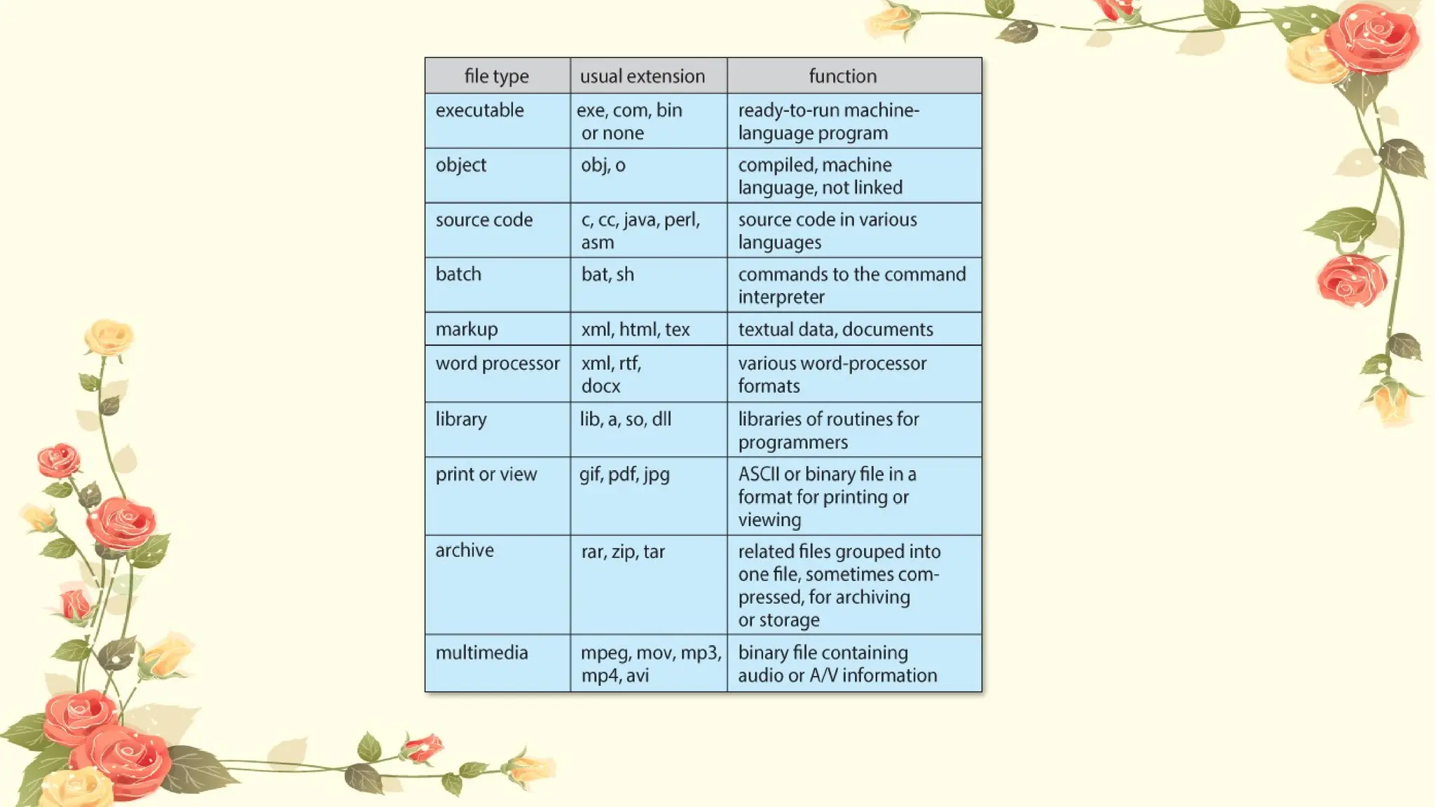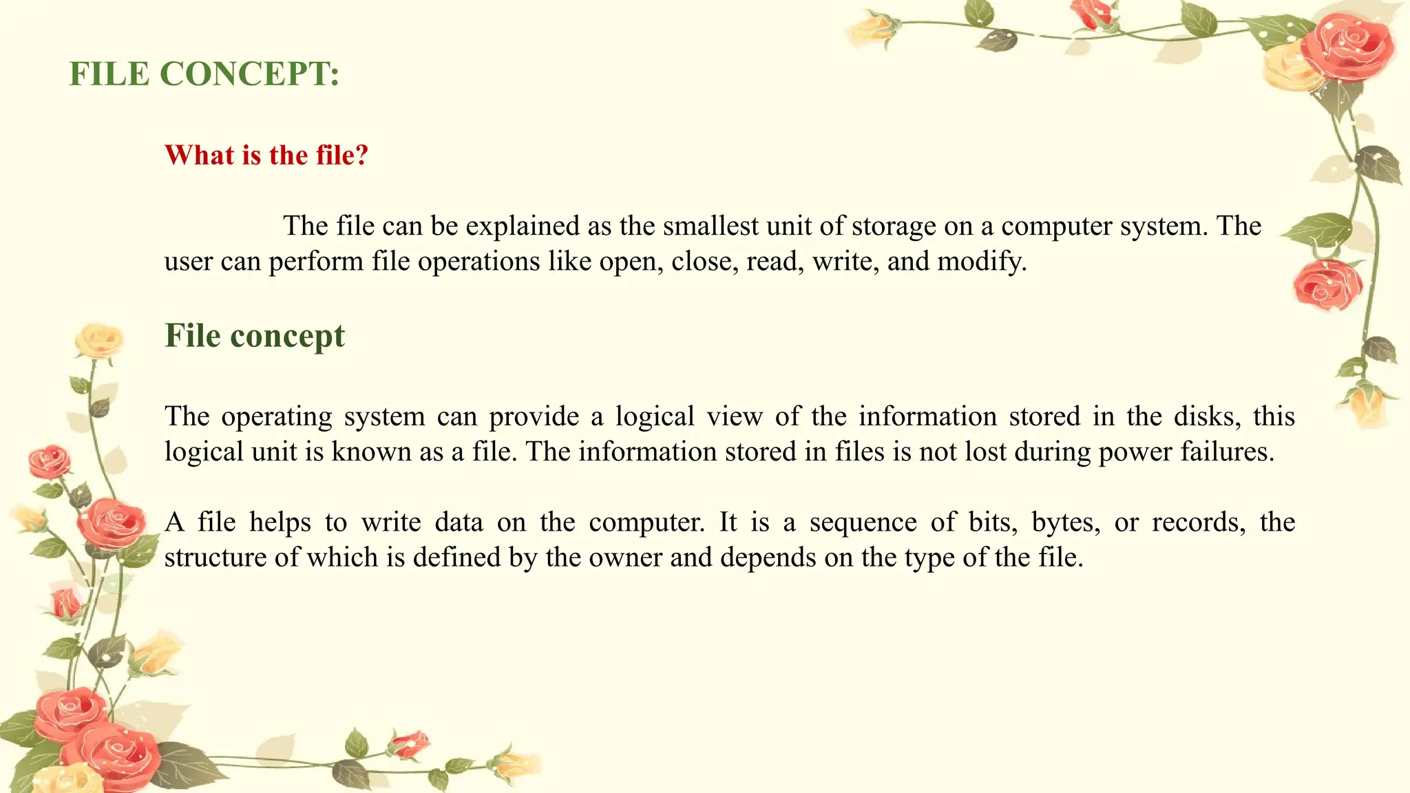 A file is the smallest unit of storage on a computer, allowing users to perform operations such as opening, reading, writing, and modifying data. Each file is named and identified within a file system, which keeps attributes such as size, location, and access permissions, while the operating system handles file types and structures to facilitate efficient data management. Various file operations include creating, deleting, and renaming files, with a logical file structure that supports easy access and organization of data on secondary storage.