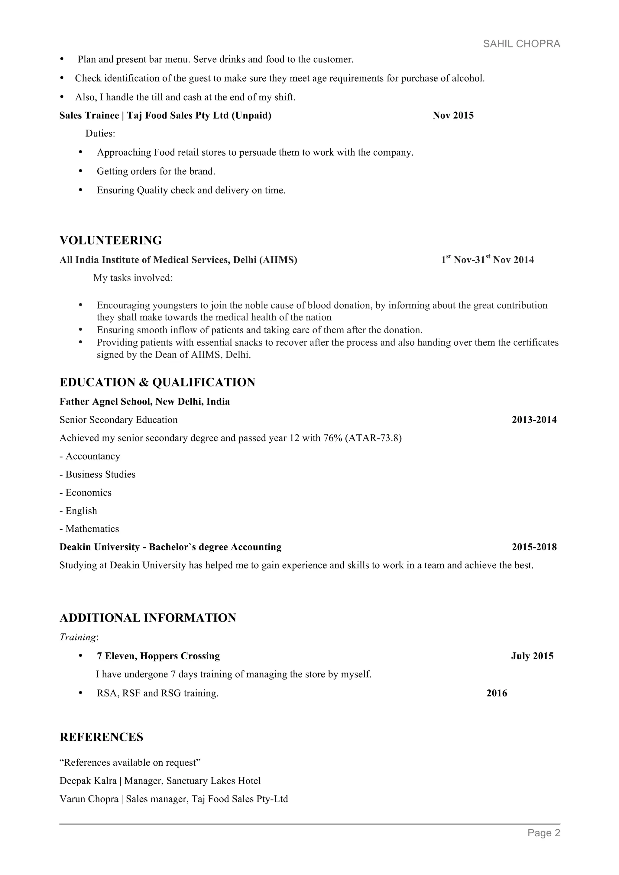 Sahil Chopra is a student of commerce and accounting at Deakin University with strong communication and teamwork skills. He has worked in customer service roles at Vodafone India and Sanctuary Lakes Hotel. He also has experience in sales through internships at Taj Food Sales and volunteering at blood donation camps in India. Sahil is studying for a Bachelor's degree in Accounting at Deakin University and believes his problem solving, adaptability and attention to detail will serve him well in his career.