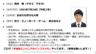 2 ◆【氏名】真砂 暁(マサゴ アキラ) ◆【生年月日】1991年7月24日(平成3年) ◆【出身地】生まれも育ちも大阪 ◆【趣味】釣り・スノーボード・ゲーム・