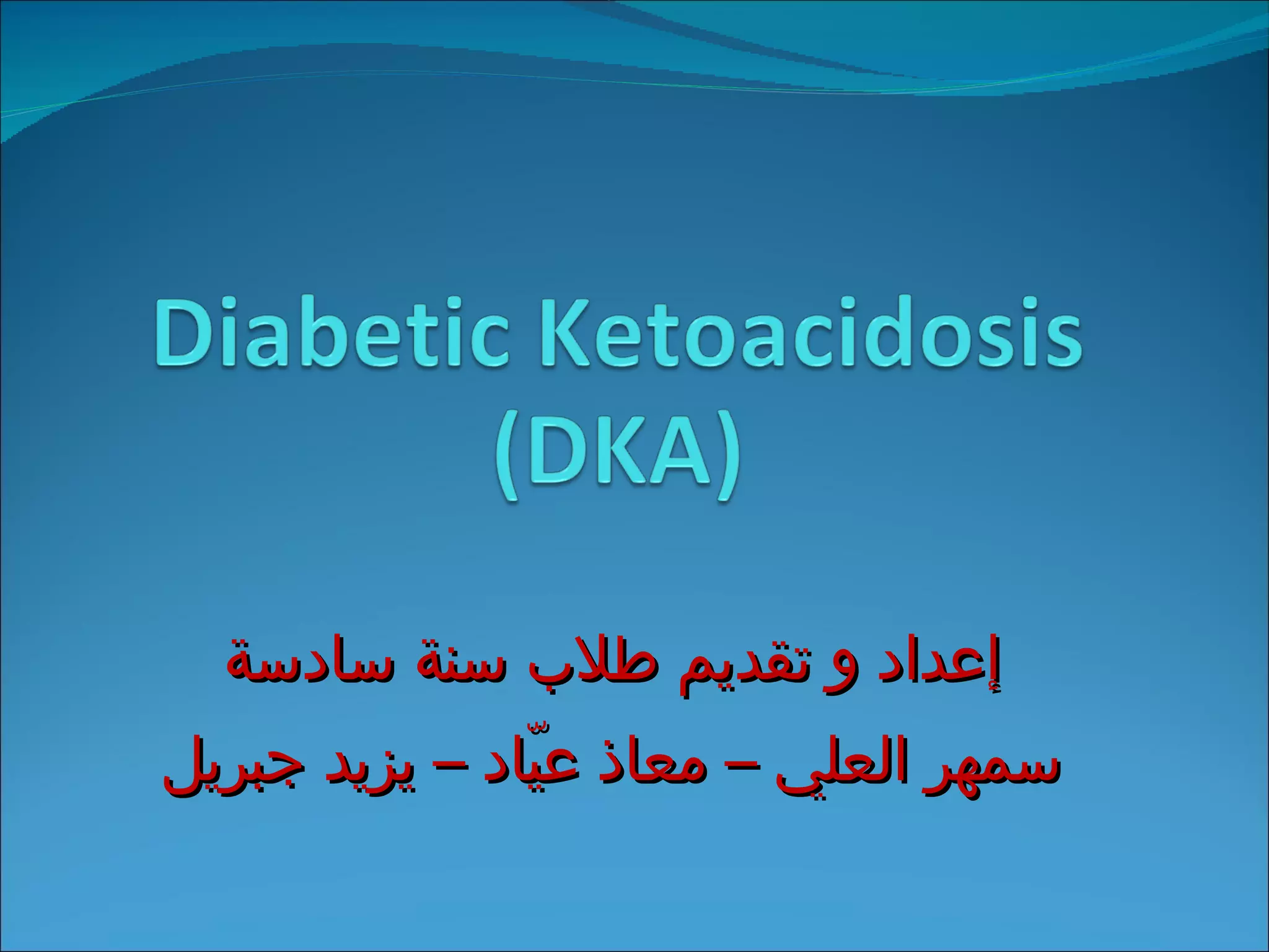 The document discusses diabetic ketoacidosis (DKA), providing definitions, pathophysiology, causes, clinical features, investigations, management, complications, and prognosis. DKA is an acute, life-threatening complication of diabetes characterized by hyperglycemia, acidosis, and ketonuria due to insulin deficiency and increased counter-regulatory hormones. Common causes include infections, inadequate insulin treatment, and medical issues like myocardial infarction. Management involves fluid resuscitation, insulin administration, electrolyte replacement, and treating any precipitating conditions. Complications can include cerebral edema, cardiac dysrhythmias, and pulmonary edema. Prognosis is generally excellent with treatment but worse for older patients with severe illnesses.