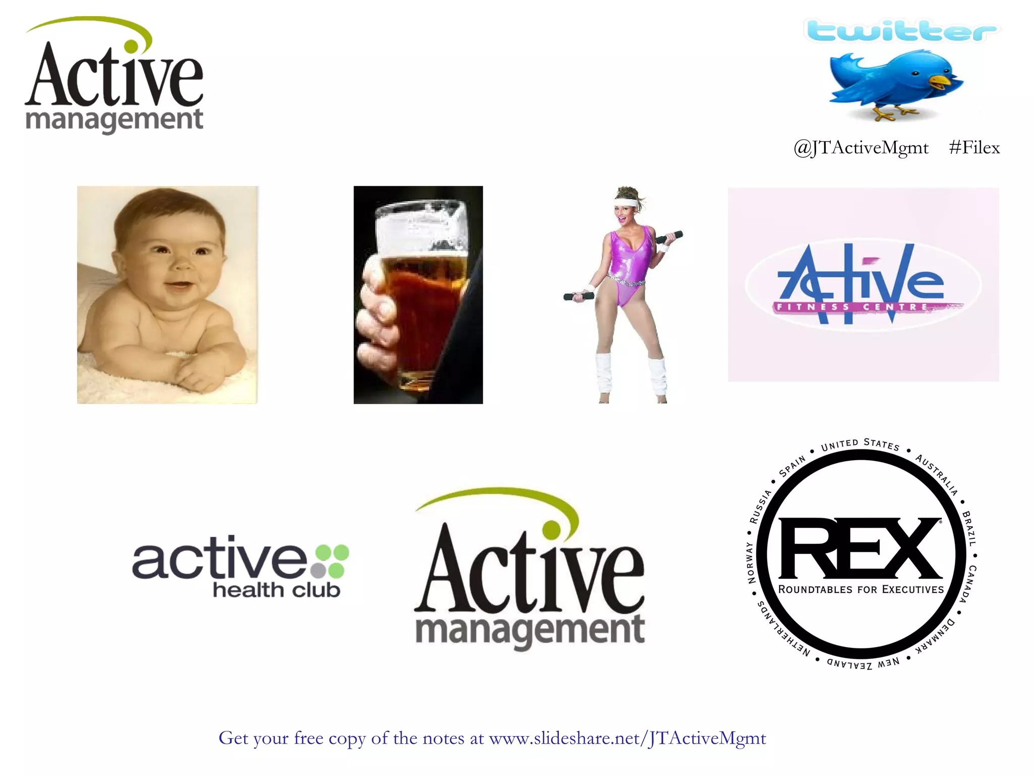 ![Justin Tamsett B.Ed (Phys & Health Education) Feel free to contact JT: [email_address] o r 0438 015 677 Follow JT on Twitter: @JTActiveMgmt To read JT’s blog: www.justintamsett.com Become an Active Management Fan on Facebook: www.facebook.com/activemanagement And for more information on Active Management helping your business go to: www.activemgmt.com.au "What you leave behind is not what is engraved in stone monuments, but what is woven into the lives of others." Pericles](https://image.slidesharecdn.com/filex2011managementtrainingintroduction-110412222424-phpapp01/75/Filex-2011-management-training-introduction-13-2048.jpg)