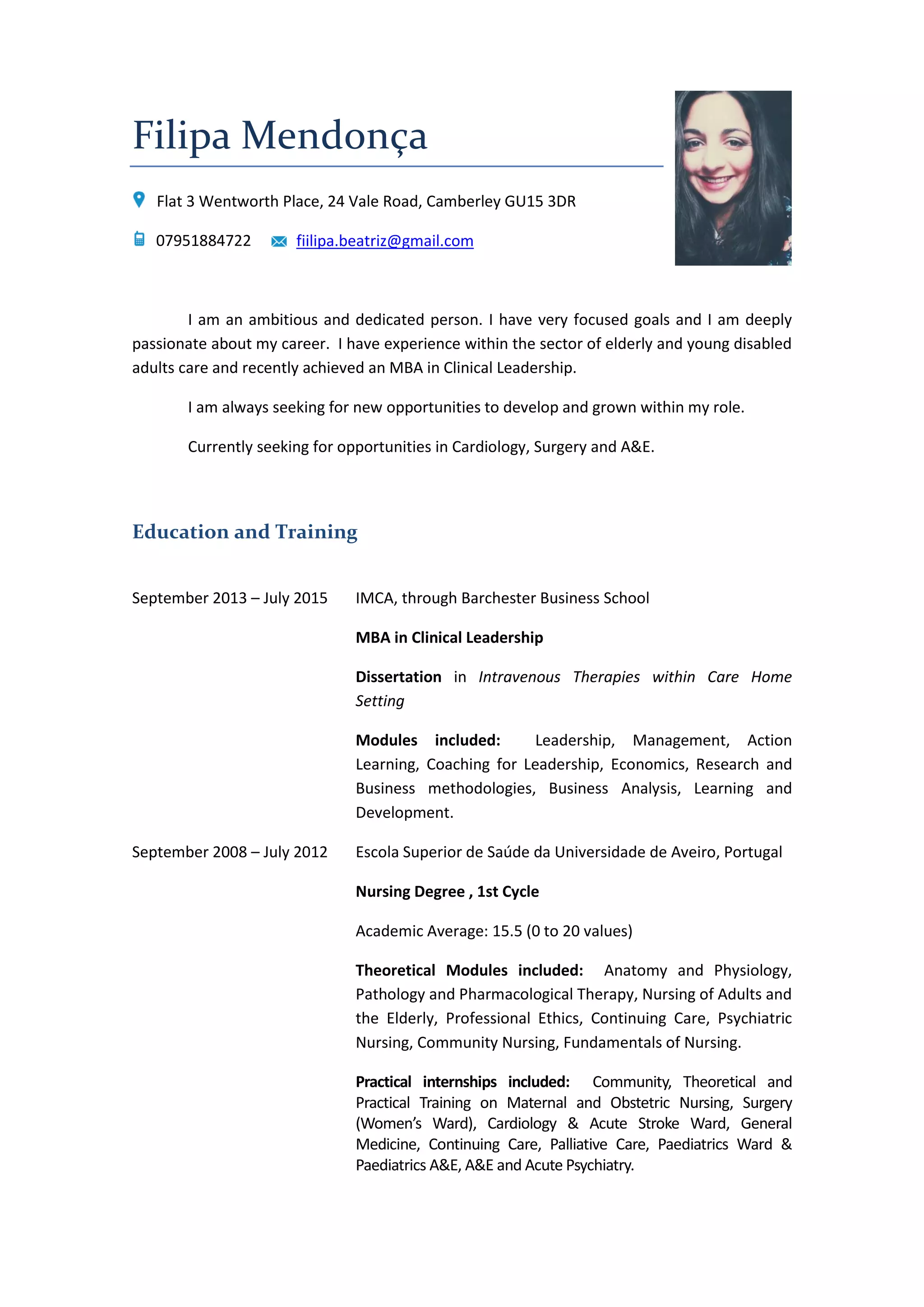 Filipa Mendonça is an ambitious and dedicated clinical nurse leader seeking new opportunities in cardiology, surgery, and A&E. She has over 8 years of experience in elderly and disabled care, including her current role as Clinical Lead Nurse at Corrina Lodge Nursing Home. Mendonça holds an MBA in Clinical Leadership from Barchester Business School and a Nursing Degree from Escola Superior de Saúde da Universidade de Aveiro. She is proficient in English and has strong leadership, communication, and organizational skills.