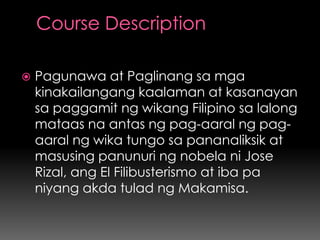 Ang dokumento ay naglalaman ng mga layunin at nilalaman ng pag-aaral ukol sa akdang El Filibusterismo at iba pang likha ni Jose Rizal, kasama ang mga aspekto ng pagsusuri mula sa panlipunan o sosyalistang pananaw. Nakatuon ito sa pag-unawa sa mga karakter at kabanata ng akda, pati na rin sa konteksto ng buhay at panahon ni Rizal. Ang mga proyekto, pagsusulit, at iba pang takdang-aralin ay nakasaad upang masukat ang pagkatuto ng mga estudyante.