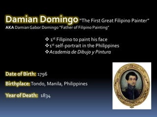 Damian Domingo was the first great Filipino painter, known for being the first to paint self-portraits in the Philippines. One of his most famous works was La Sagrada Familia, painted in the 1820s-1830s, which depicts the Holy Family and is noted for its delicate details and realistic cloth folds. Juan Luna was the first recognized Philippine artist and painted Spoliarium, his most well-known piece, in 1884 while studying in Rome - it depicts a brutal scene symbolizing humanity's struggle against injustice. Felix Resurreccion Hidalgo painted Las virgenes Cristianas expuestas al populacho in 1884, receiving a silver medal, which depicts persecuted Christian