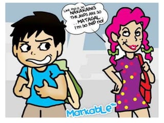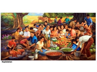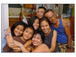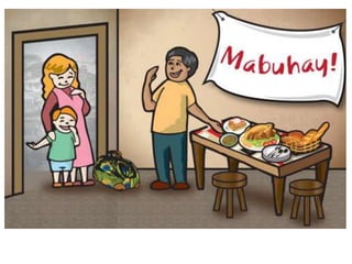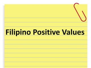 This document summarizes key positive and negative values of Filipino culture. The positive values discussed include being joyful, respectful, god-fearing, having a spirit of bayanihan or community cooperation, being brave and having strong family ties, hospitality, hardworkingness, and creativity. Negative values examined are laziness, having a colonial mentality, kanya-kanya or crab mentality, bahala na attitude, ningas-cogon or lack of follow-through, lack of self-analysis, and lack of discipline. The document provides examples and explanations for each value.