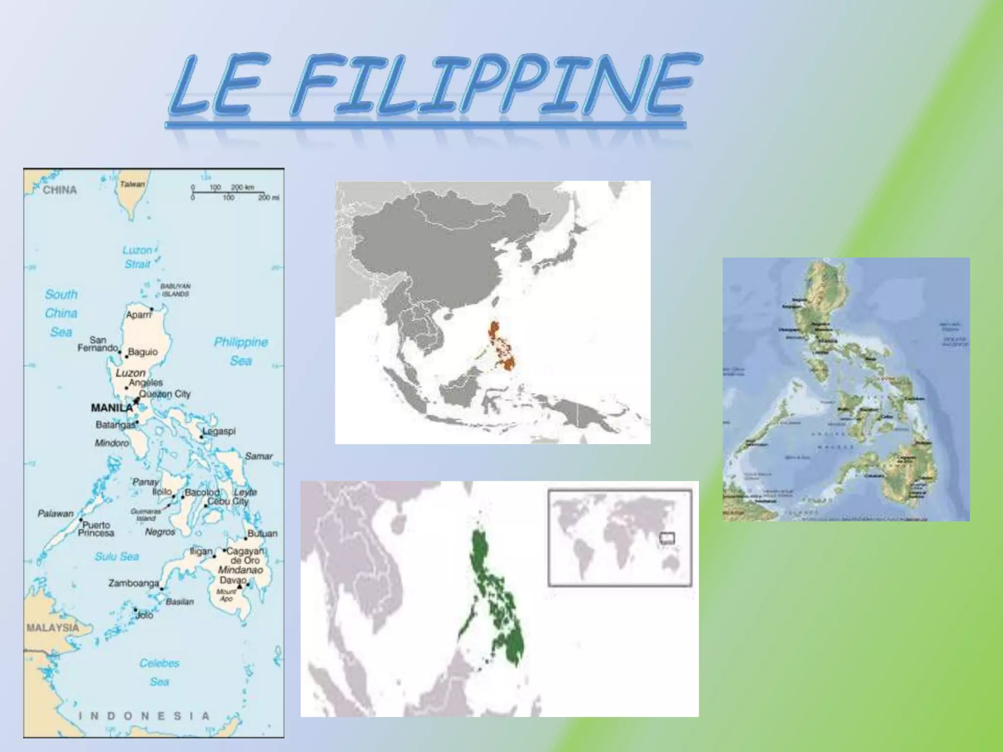 Le Filippine sono uno stato del sud-est asiatico con un clima tropicale, suddiviso in tre stagioni. La popolazione è prevalentemente di origine austronesiana, con una maggioranza cristiana, e la capitale è Manila. L'economia si basa principalmente sulla pesca, agricoltura e turismo.
