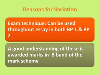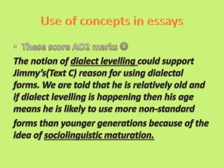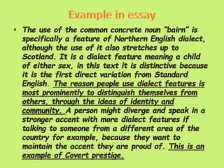 This document discusses exam technique for answering questions on prestige and language variation. It covers overt and covert prestige, the types of prestige associated with education, wealth, and class. Solidarity and identity prestige are discussed. Language phenomena like anti-language, pidginization, and creolization are mentioned. The document lists sociolinguists like Edwards, Cheshire, Trudgill, Labov, Sebba, and Fox. Attributes linked to language variation include aesthetic appeal, correctness, laziness, status, intelligence, and trustworthiness.