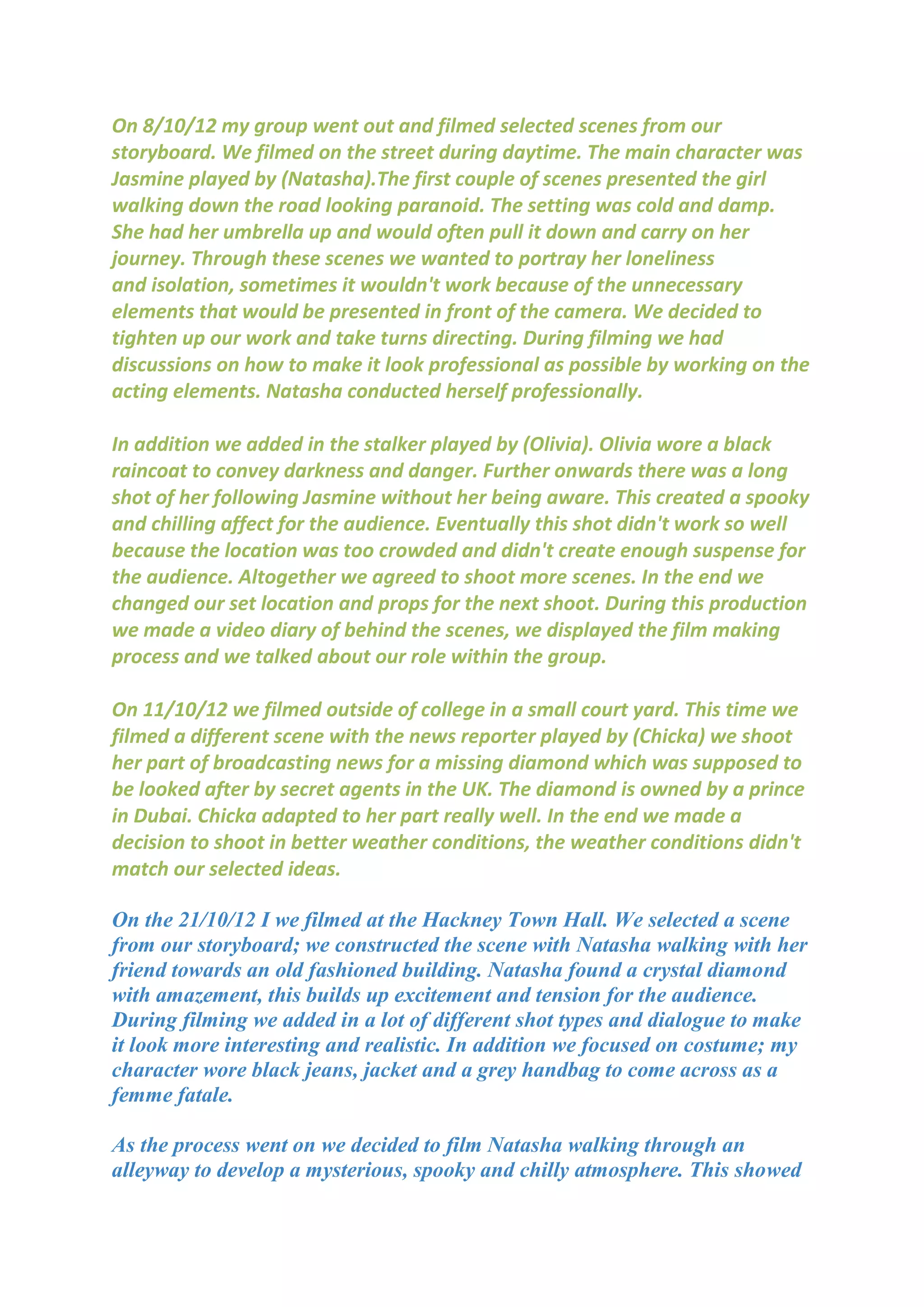 The document describes a film production group's process of filming scenes over multiple dates to tell the story of a woman named Natasha. On the first filming date, they shot scenes of Natasha walking alone looking paranoid, and added a character named Olivia to portray a stalker following her. Subsequent filming dates focused on different scenes with other characters at various outdoor locations. The group worked to improve their filming techniques, use of equipment, and ability to convey mood and tension through shots, lighting, costumes and other cinematic techniques. They reflected on ways to strengthen the character development and plot structure to engage the audience. Images from the production are also included.