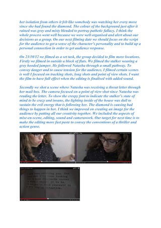 The document describes a film production group's process of filming scenes over multiple days to tell a story. It discusses the scenes they filmed, locations used, costumes, and shots they took. It also reflects on improvements made between filming sessions, such as changing locations due to weather or tightening the script. The goal was to convey tension, danger, and a mysterious atmosphere through the filming techniques and storyline as it progressed.