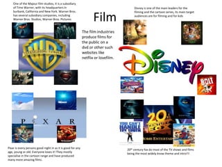 Warner Bros. is one of the major film studios headquartered in Burbank, California and New York. It has several subsidiary companies including Warner Bros. Studios and Warner Bros. Pictures. Pixar specializes in animated films for audiences of all ages and has produced many acclaimed films. 20th Century Fox produces many television shows and films and is widely known for its theme and opening intro.