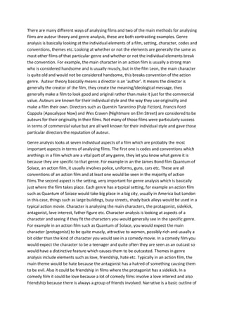 There are two main methods for analyzing films: auteur theory and genre analysis. Genre analysis examines elements like setting, characters, codes, conventions, and themes to determine if a film follows or breaks from the conventions of its genre. For example, the main character in Leon breaks the action film convention of being a handsome, muscular man. Auteur theory posits that certain directors like Quentin Tarantino, Francis Ford Coppola, and Wes Craven have unique styles and prioritize original artistic expression over commercial success, earning them status as "auteurs". Genre analysis specifically looks at seven elements: codes and conventions, setting, characters, themes, narrative, iconography, and ideological messages. These elements are