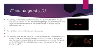 The document analyzes the opening scene of the film "Goodfellas" through its cinematography, mise-en-scene, sound, titles and text, and target audience. The opening scene uses dark lighting and angles that make the audience feel they are moving with the characters' car at night. It establishes the three main characters looking tired while driving and later shows them in the woods with a man in the trunk who is injured. The document analyzes how the film's elements create tension and intrigue for the audience.