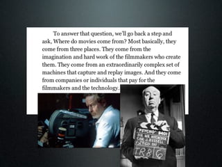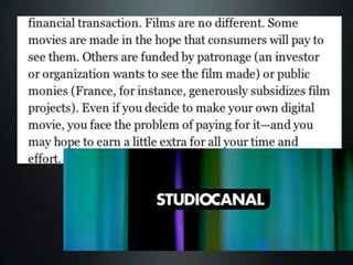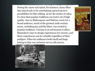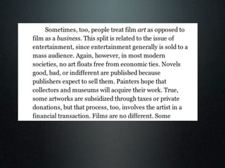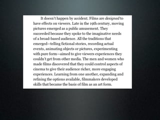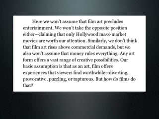 According to the seminal book "Film Art" by Bordwell and Thompson, film language refers to the basic techniques of cinema and how they function together to create meaning within a film. The document discusses how understanding film language and genre conventions is essential for students to create their own short films and effectively analyze other films. Students are advised to research the history and techniques associated with the genre they choose and apply some conventions in their own work.