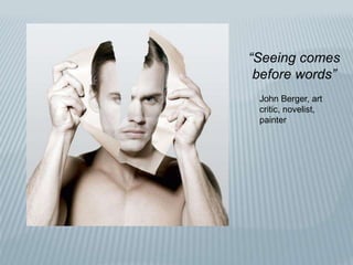 The document discusses various techniques used in filmmaking to tell visual stories. It begins by explaining that films use pictures and sounds, in addition to words, to convey meaning. It then covers concepts like mise-en-scène, cinematography, editing techniques, narrative structures, and semiotics - how meaning is constructed through signs and symbols in film. Overall, the document illustrates that film is a complex visual text that uses multiple artistic and technical elements purposefully arranged to immerse viewers in fictional worlds and communicate ideas.