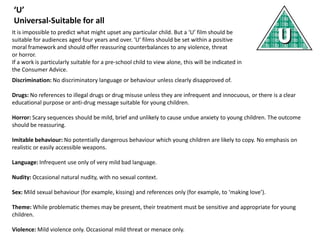 This document summarizes the film classification system used in the UK. It provides descriptions of the rating categories which include Universal ('U'), Parental Guidance ('PG'), 12/12A, 15, 18, and R18. Each rating category is defined by the types of content it may contain in terms of themes, language, violence, sex, drugs and more. The most restrictive categories, 18 and R18, have very specific rules around the explicit sexual content they may include.