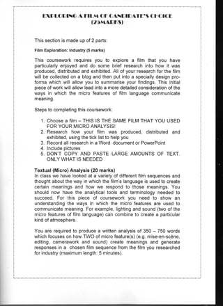 This document provides guidance for a film studies coursework assignment. It is divided into four parts: 1) Exploring a film of the student's choice, 2) Pitch and preproduction, 3) Production, and 4) Evaluative analysis. For part one, students must analyze how film language like cinematography and sound create meaning in a scene from their chosen film. They are provided instructions on researching the film's production, distribution, and exhibition to learn about the film industry. Students are directed to record their research on a blog and fill out a form to summarize their findings.