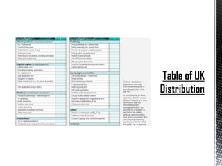 A film distributor is responsible for marketing and distributing a film. They work to secure contracts with exhibitors like movie theaters to show the film. Distributors must ensure there are enough film prints, deliver the film to theaters on opening day, and collect it after closing. They handle tasks like dubbing for foreign films. Getting a film into theaters during its first weekend is important for its overall success. Distributors consider factors like the target audience, competition from other releases, and star power when planning their marketing strategy and release.