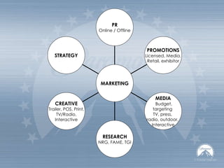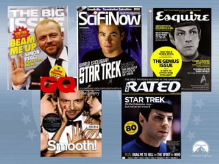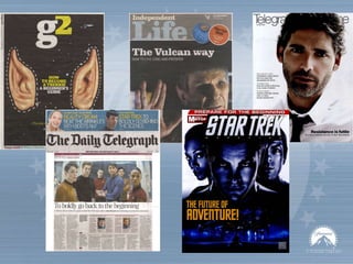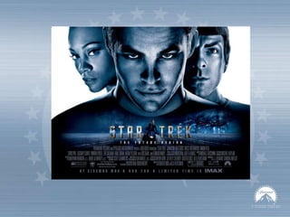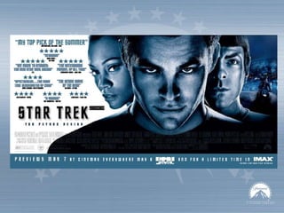 The document outlines the marketing strategy for the blockbuster film Star Trek. It discusses setting the strategy by determining the genre, target audience, and release timing. The core audience is identified as 12-34 year old males. The marketing mix includes a focus on event TV, dominating outdoor advertising, and innovative online campaigns. Creative assets include trailers, posters, and TV spots. Promotional activities include licensing, third party promotions, retail partnerships, and word of mouth screenings. The film was a box office success due to strong word of mouth and reviews.
