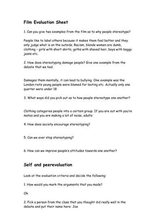 The document summarizes a film evaluation sheet that asks questions about stereotyping. 1) It gives examples of why people stereotype others based on appearances and labels. 2) Stereotyping can damage people mentally and lead to bullying, using the example of young people being blamed for London riots. 3) Ways people stereotype include judging others based on clothing choices.