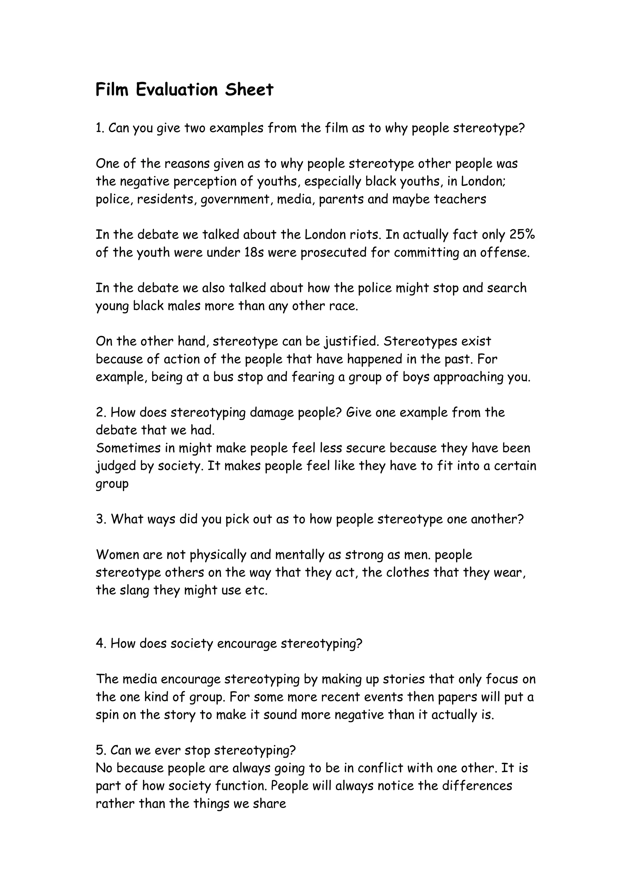 1. The document discusses stereotyping and provides examples from a film debate. It notes that only 25% of youth involved in London riots were under 18, and that police disproportionately stop and search young black males.