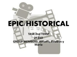 The document summarizes an epic historical film assignment for a group of Spanish students. The film is Gladiator directed by Ridley Scott from 2000. It details the plot of the film which follows Roman general Maximus who becomes a gladiator after the emperor's son has his family killed and he is no longer named as the emperor's successor despite being chosen by Marcus Aurelius before his death. As a gladiator, Maximus is very brave but ultimately dies at the end of the film.