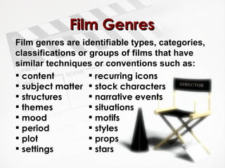 The document defines and discusses various film genres and subgenres. It provides examples of primary genres like action, adventure, comedy, crime, drama, epics, horror, musicals, science fiction, war films, and westerns. For each genre, it lists representative subgenres and provides brief descriptive definitions.
