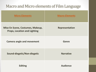 This document discusses the micro and macro elements of film language. Micro elements include mise-en-scene, camera movements, diegetic/non-diegetic sound, and editing techniques. Macro elements include representation, genre, narrative, and audience. These elements work together to construct meaning and engage audiences in film.
