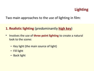 This document provides an overview of key cinematography techniques used to convey meaning and emotion in film, including lighting, color, camera work, and composition. It discusses two main approaches to lighting - realistic lighting using three-point lighting for a natural look, and expressive low-key lighting to create shadow and mood. It also covers camera angles, movement, position/framing, composition using rules of thirds, and depth of field. Examples are given from famous films to illustrate different techniques.