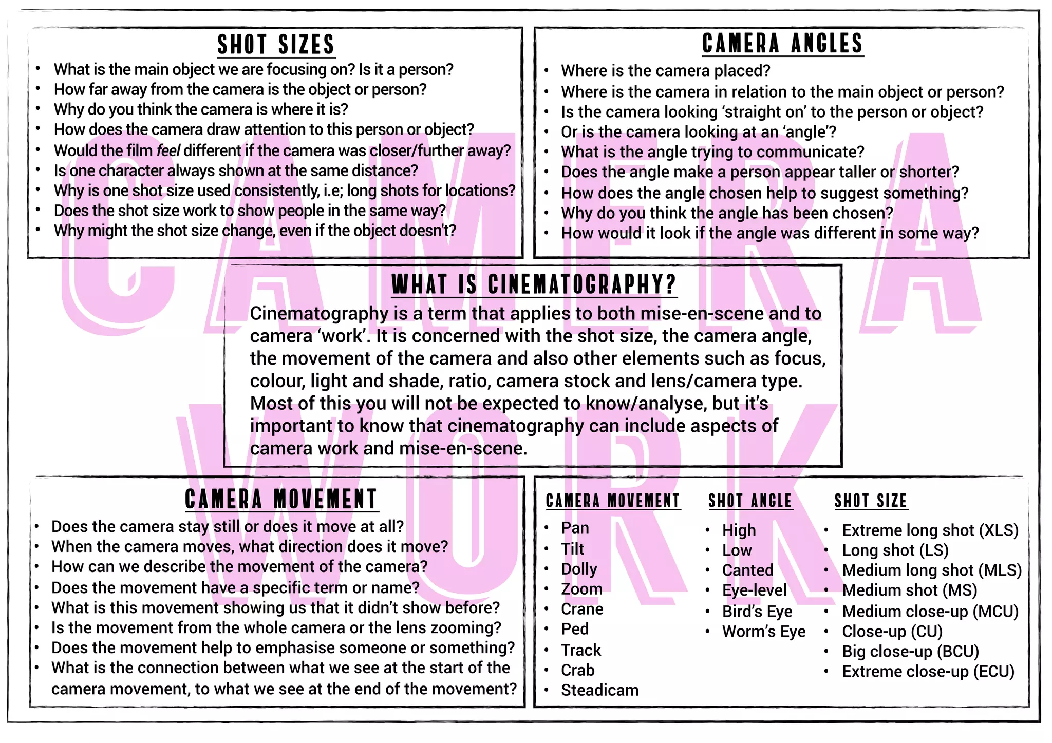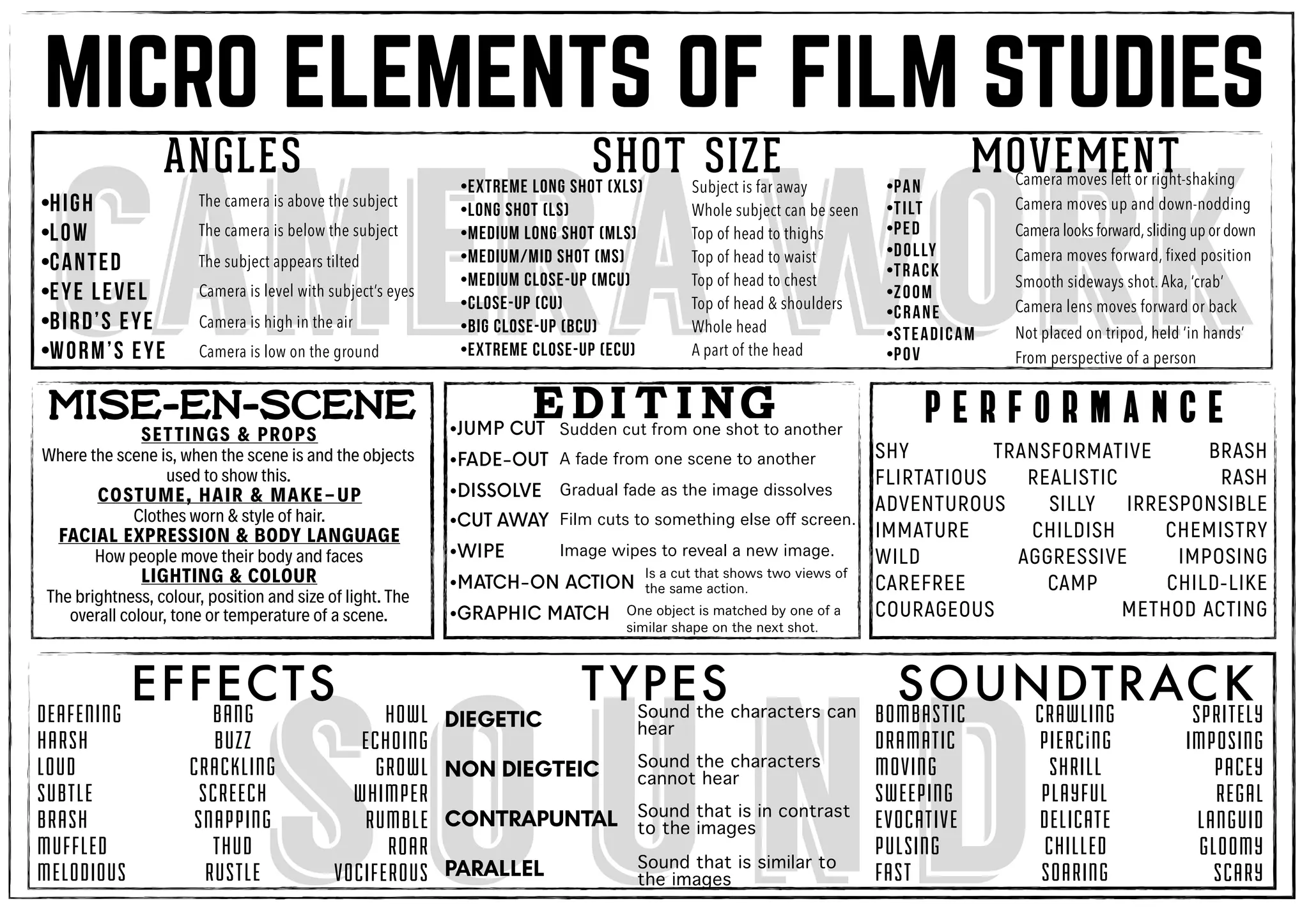 The document explores various micro elements of film studies, focusing on camera work, mise-en-scène, sound, and editing techniques. It details the impact of shot sizes, angles, and movements on storytelling, as well as the importance of setting, props, and character expressions in conveying emotions. Additionally, it discusses sound elements, including soundtrack, score, and sound effects, emphasizing their roles in enhancing the narrative and audience experience.