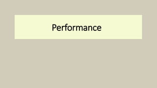 This document discusses performance in acting and provides guidance for directing actors. It defines performance as the meanings conveyed through physical performance using facial expressions, gaze, gestures, posture, body contact, appearance, and spatial behavior. It then provides an example script and asks the reader to discuss directions they would give actors for different characters. It also analyzes Marlon Brando's performance as Don Corleone in The Godfather, considering facial expressions, gaze, gestures, posture, body contact, appearance, and spatial behavior. Finally, it notes that actors should be able to blend into their characters using various acting techniques.