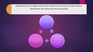 This document discusses the relationship between literature and cinema. It notes that both are narrative art forms used to tell stories. However, literature uses words while cinema uses images. When literature is adapted to film, it often results in a reduction or narrowing of the original work by removing its novelistic elements. The document also discusses genres in cinema and how films are classified. It addresses the purpose and format of film scripts and how their techniques can be learned through talent and practice.