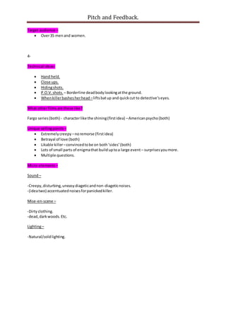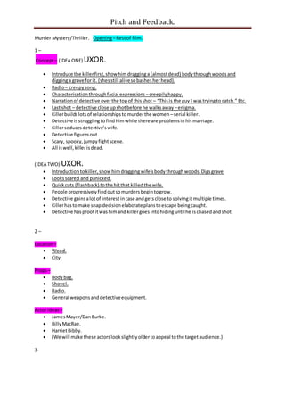 This document outlines two concepts for a murder mystery/thriller film. The first concept involves a serial killer who builds relationships to murder women and seduces the detective's wife, leading to a climactic fight scene. The second concept involves a killer who murders his wife and must cover it up by killing others, with the detective coming close to solving the case multiple times. Both concepts would feature scenes of the killer dragging a body through woods and digging a grave, and involve a detective struggling to catch the killer. The document provides suggestions for locations, props, actors, technical elements, comparable films, unique selling points, and micro-elements for each concept.