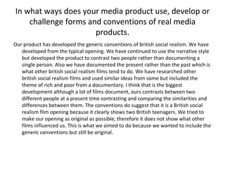 The document discusses a film opening project that uses conventions of British social realism to contrast the morning routines of two teenagers from different social classes. It represents the social groups of age and social class through stereotypical depictions of an upper class and lower class teenager. The film opening could potentially be distributed by a major Hollywood studio or as a TV movie due to its interesting plot and ability to educate viewers about different social groups and homelessness. The primary audience would be teenagers and young adults who could relate to the characters and themes. Technologies like Final Cut Pro, GarageBand and camera equipment were used to construct the product and the filmmakers learned skills like sound synchronization, soundtrack production and shot composition through completing the project.